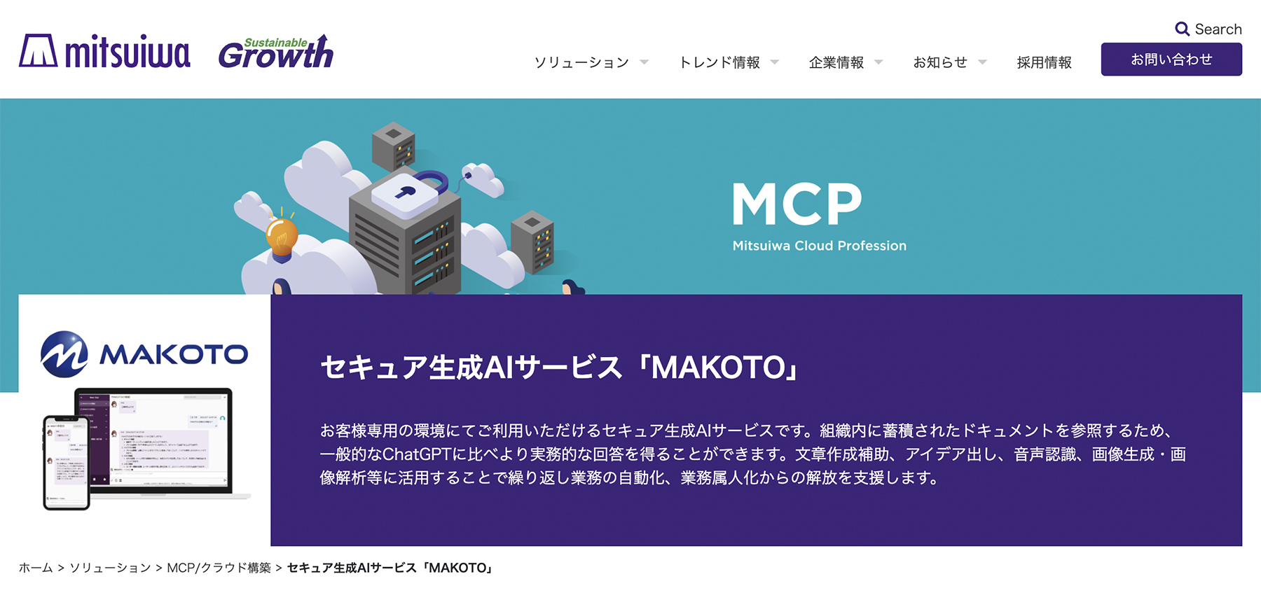 このような企業ニーズとAzure OpenAI Serviceの技術的な強みを結びつけ、日本企業向けに最適化されたソリューションとして登場したのが、ミツイワが提供するセキュア生成AIサービス「MAKOTO」です。MAKOTOは、Azure OpenAI Serviceを基盤とし、前述のRAG構造をパッケージ化することで、企業がゼロからセキュアなAI環境を構築する手間と時間を大幅に削減します。