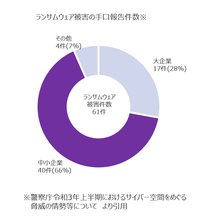 感染した端末のデータを暗号化し金銭の要求を行うランサムウェアの被害件数が急増しています。 令和3年上半期に都道府県警察から警察庁に報告のあった件数は61件で、昨年下期の21件と比べて3倍も増加しました。 また、ランサムウェアの特徴も変わってきています。データを暗号化しデータを搾取したうえ金銭の要求を行うだけでなく、情報の公開をネタに金銭の要求を行う、二重恐喝(ダブルエクストーション)という手法が発生しています。中小企業が主なターゲットに